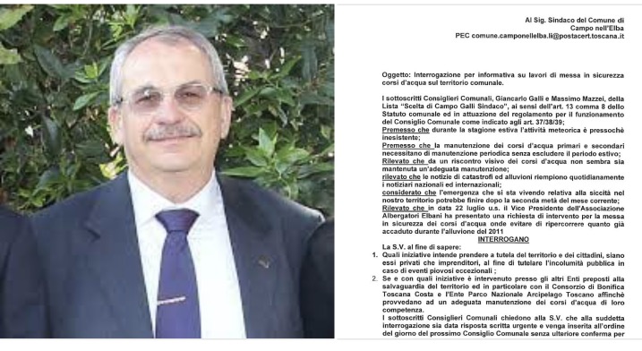 Galli speiega: “Vorrei porre l’attenzione sulla situazione della mancata pulizia dei corsi d’acqua nel territorio del Comune di Campo nell’Elba. In data 14 Agosto u.s., a seguito di una comunicazione dell’Associazione Albergatori Elbani inoltrata in data 22 Luglio 2021 al sindaco del Comune di Campo nell’Elba, al presidente del Parco Nazionale Arcipelago Toscano e al Consorzio di Bonifica Toscana Costa, era stata evidenziata la necessità di mettere in sicurezza gli alvei dei fossi e la pulizia necessaria al fine di prevenire eventuali danni per eventuali precipitazioni meteoriche eccezionali”.