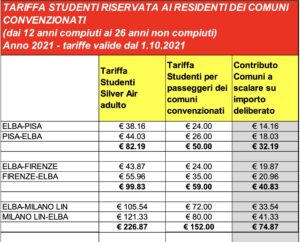 L’Amministrazione Comunale rende noto che in data 4/11/2021 è stato integrato l’accordo con la compagnia Silver Air per l’applicazione di tariffe agevolate per il trasporto di studenti residenti a Capoliveri a Pisa, Firenze e Milano per motivi di studio. Il Comune ha già da tempo stipulato un altro accordo, tuttora in vigore, per l’applicazione della tariffa “medical” ovvero tariffe scontate ai cittadini residenti che per visite ed esami medici devono recarsi fuori Elba.