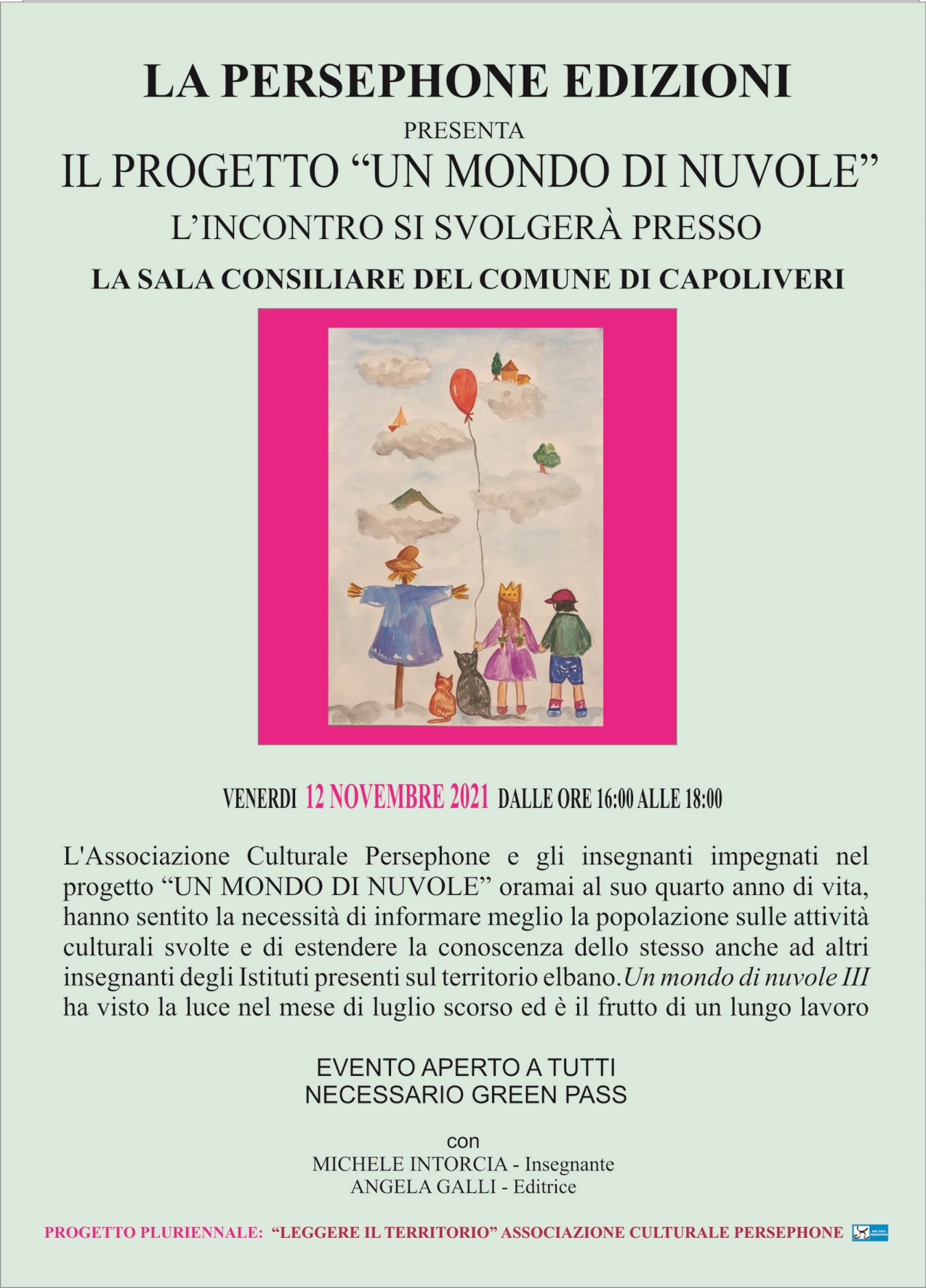 Venerdì 12 novembre nella sala consiliare del comune di Capoliveri sarà presentato il progetto “Un mondo di nuvole”, un’iniziativa che vede coinvolti l’istituto comprensivo Giusti di Campo nell’Elba, il Puccini di Parma, il Pertini di Portoferraio, il Valtenesi Manerba del Lago di Garda e l’istituto Omnicomprensivo Sergio Marchionne di Amatrice con il coordinamento dell’associazione culturale “Persephone”. Alla presentazione del progetto, prevista a partire dalle 16, parteciperanno i docenti Michele Intorcia e Lisa Stretti che esporranno l’iniziativa, le difficoltà, le possibilità evolutive e organizzative per la costruzione della rete nazionale di istituti scolastici e altre realtà culturali. Il progetto nato all’Elba è alla sua quarta edizione. Partito dal coinvolgimento delle scuole del territorio elbano quest’anno vede coinvolte altre scuole d’Italia. “Un mondo di nuvole III – spiegano i responsabili dell’associazione Persephone – ha visto la luce nel mese di luglio scorso ed è frutto di un lavoro svolto da docenti ed alunni in cinque istituti italiani, all’interno di una rete di relazioni che ha disegnato una nuova geografia scolastica. E’ stato seguito anche da Indire ( l’istituto nazionale documentazione innovazione ricerca educativa)”. Costituisce un inedito di racconti, miti, poesie, favole, disegni e, per la prima volta, di narrazioni musicali che si può ascoltare sul canale youtube “un mondo di nuvole in musica” pubblicato con la casa editrice elbana, Persephone Edizioni.