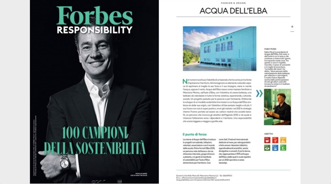 10 pagine per presentare100 campioni della sostenibilità: aziende che Forbes ha selezionato per gli sforzi verso una sostenibilità non solo sul piano ambientale ma anche su quello economico e sociale. Tra le aziende menzionate, anche Acqua dell’Elba, con il suo progetto pensato per le persone e per l’ambiente.