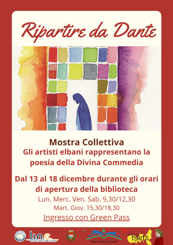 Dal 13 al 18 dicembre, in biblioteca, sarà allestita una mostra collettiva di artisti che hanno realizzato per questa occasione opere liberamente ispirate alla Commedia: Antonella Avanateo, Maria Giusi Canova, Morgana Cavicchioli, Armando Gemmo, Remo Giatti, Francesca Groppelli, Luca Polesi e Chiara Scalabrino. Con tecniche diverse hanno interpretato, secondo la propria ispirazione, un passo o un’immagine dell’universo dantesco, sarà un percorso tra la poesia senza tempo e la contemporaneità!. Per rimanere aggiornati sulle iniziative seguite la pagina Facecebook Biblioteca Comunale di Campo nell’Elba (BiblioteCampo)