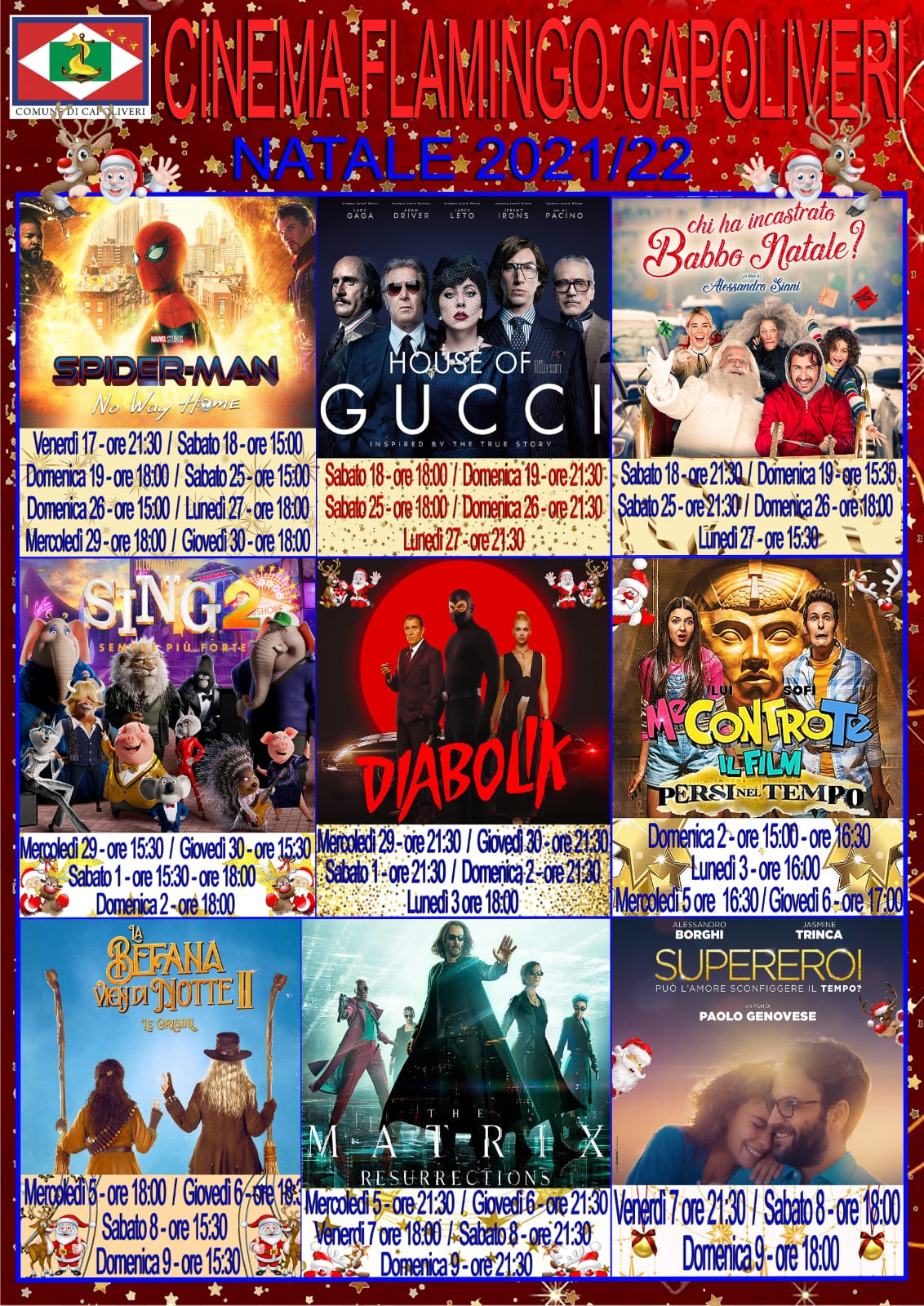 Il cinema teatro Flamingo di Capoliveri presenta un cartellone di grande importanza con titoli di prima visione per la programmazione dei film durante il periodo delle festività natalizie. Spiderman no Way Home, Cose of Gucci, chi ha incastrato Babbo Natale, Sing2, Diabolik, Me contro te, La Befana vien di notte, Matrix Resurrections, Supereroi, può l’amore sconfiggere il tempo? Questi i titoli in programmazione per potere accontentare tutti i gusti degli amanti del grande schermo.