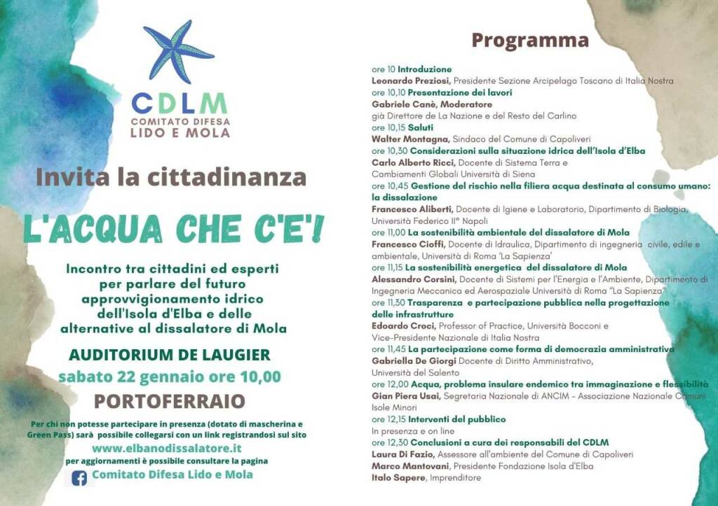 Sale progressivamente il coinvolgimento dei cittadini elbani e non per l’iniziativa del CDLM (Comitato per la difesa di Lido e Mola) sul tema del Dissalatore, in programma il 22 Gennaio prossimo venturo dalle 10 alle 13 presso l’Auditorium De Laugier di Portoferraio.
