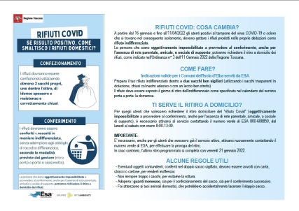 Per quegli utenti che volessero richiedere il ritiro domiciliare del “rifiuto Covid” (oggettivamente impossibilitate a provvedere al conferimento, anche per l’assenza di rete parentale, amicale, o sociale di supporto), è necessario attivarsi al servizio contattando il numero verde di ESA 800-688850, dal lunedì al sabato con orario 8:00-13:00.