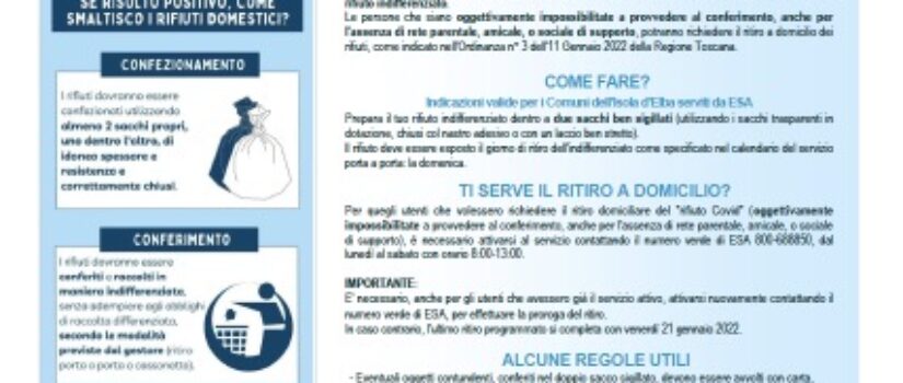 A partire dal 16 gennaio e fino all'11/04/2022 gli utenti positivi al tampone del virus COVID-19 o coloro che si trovano nel conseguente isolamento, devono gettare i rifiuti prodotti nelle proprie abitazioni come rifiuto indifferenziato. Le persone che siano oggettivamente impossibilitate a provvedere al conferimento, anche per l'assenza di rete.