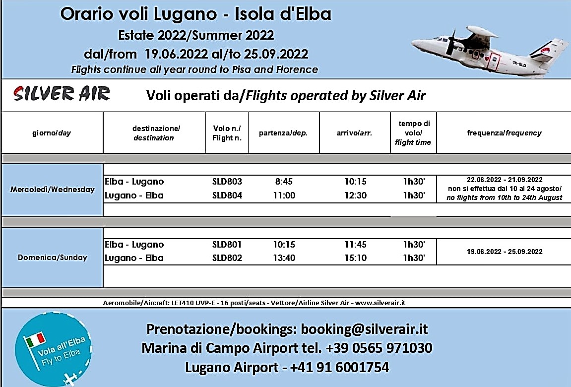 Al via le prenotazioni per la tratta aerea Lugano Elba per l’estate 2022 con la compagnia Silver Air. E’ possibile chiamare l’ufficio all’aeroporto di Lugano al numero 091 6001754, oppure quello presso l’aeroporto di La Pila a Marina di Campo +39 0565 971030. I voli con la cittadina svizzera iniziano dal 9 giugno, e termineranno al 25 settembre. Possibili pacchetti “volo + soggiorno” nelle migliori strutture dell’Isola d’Elba.