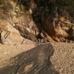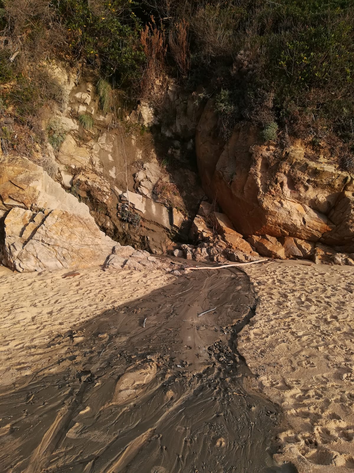 La ‘colata’ è ben visibile vicino al passaggio sugli scogli tra Biodola e Scaglieri: si è depositata sulla sabbia, scorrendo giù attraverso un precipizio, ora ‘incementato’ dallo stesso materiale e in corrispondenza della sommità, sulla strada per Scaglieri, un tombino con un tubo aperto, contiene resti della stessa sostanza cementizia.