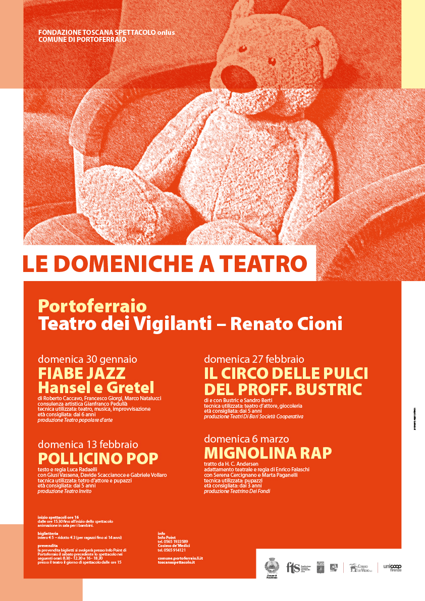 Al via dal 30 gennaio al Teatro dei Vigilanti di Portoferraio la rassegna dedicata ai più piccoli e alle loro famiglie, Le domeniche a teatro. Quattro appuntamenti per sognare e stimolare la fantasia la domenica pomeriggio (inizio ore 16:00) fino al 6 marzo.