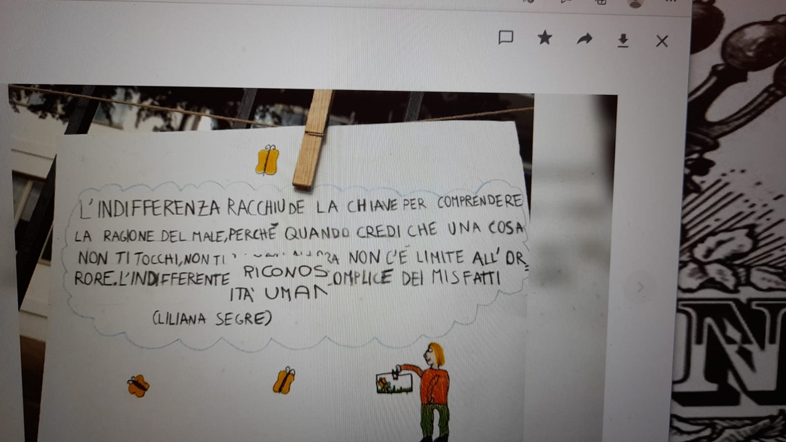 Tre alunni di quinta hanno poi presentato la storia di un loro parente ebreo realizzando didascalie e tavole utilizzando la tecnica del kamishibai . Alla secondaria Pascoli, infine, i ragazzi dell’Indirizzo musicale hanno eseguito 4 brani , tra cui Shindler’s list e Gam Gam, collegati con le altre classi e gli alunni in Dad, e le terze della scuola hanno mostrato i loro lavori on line, con presentazioni, poesie e letture.