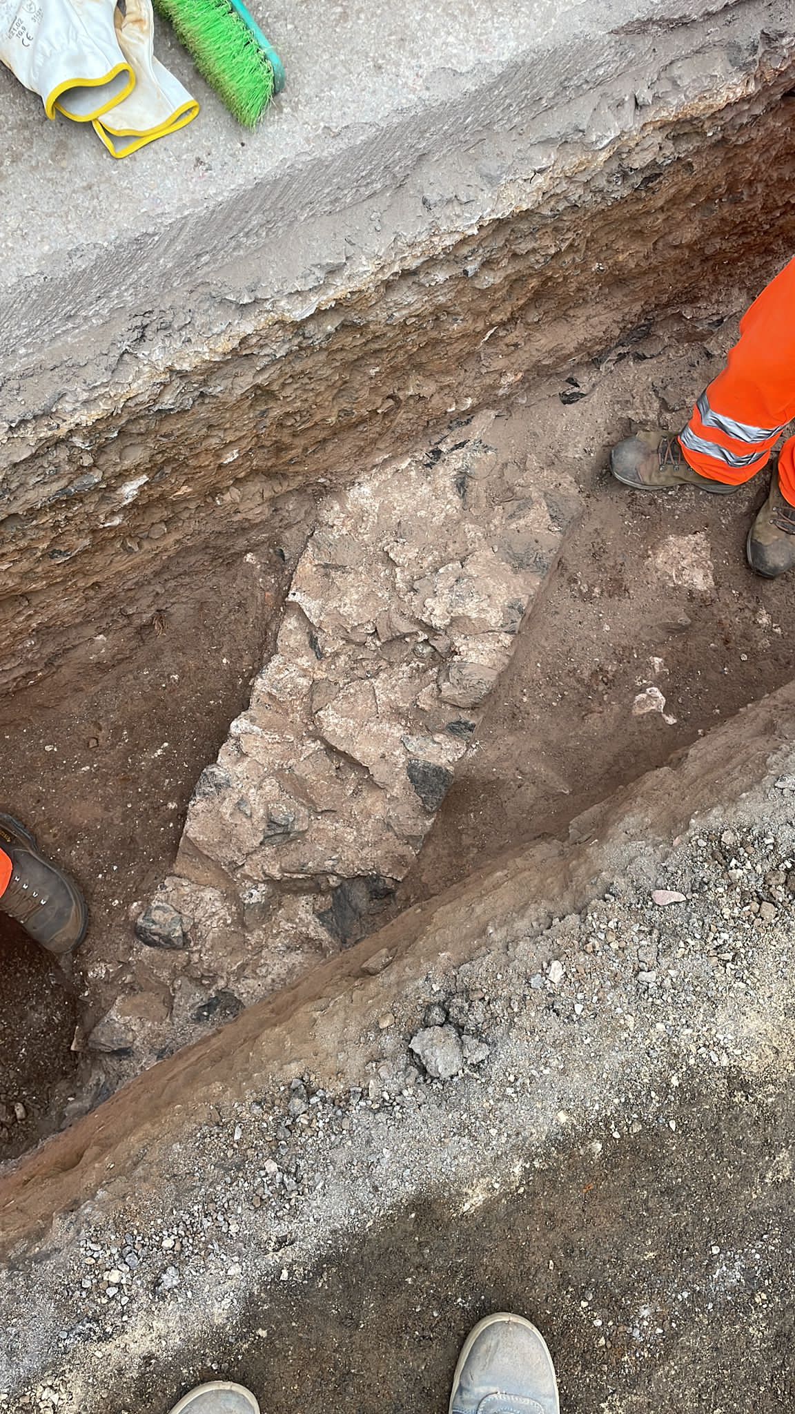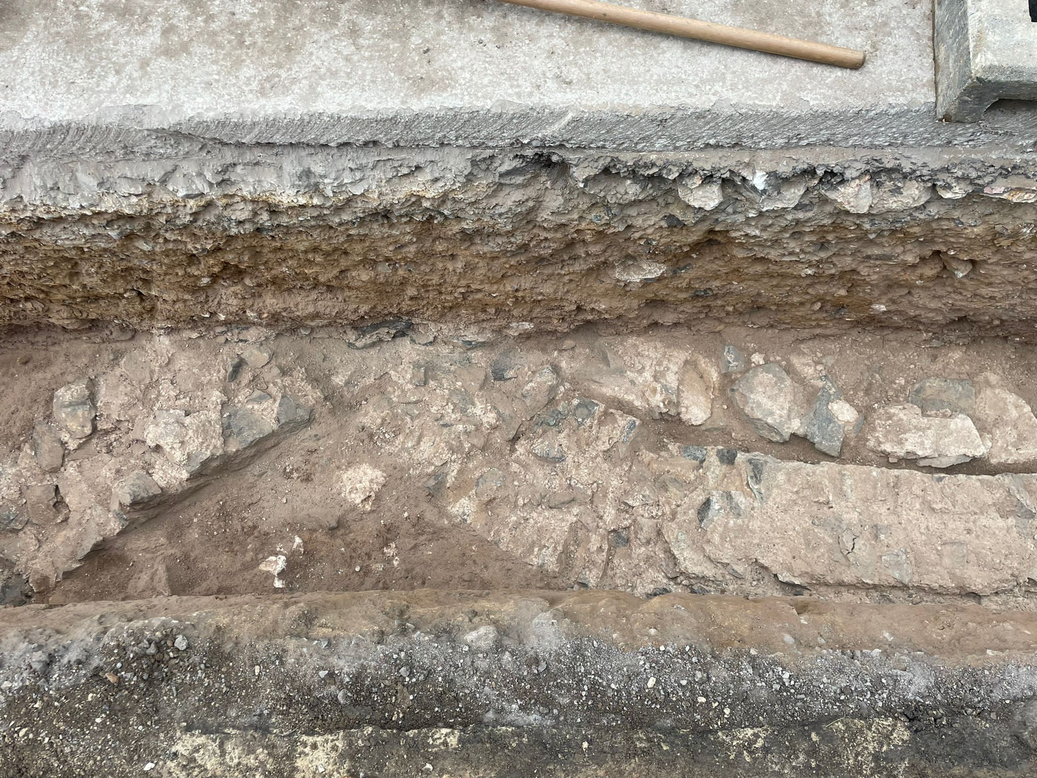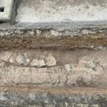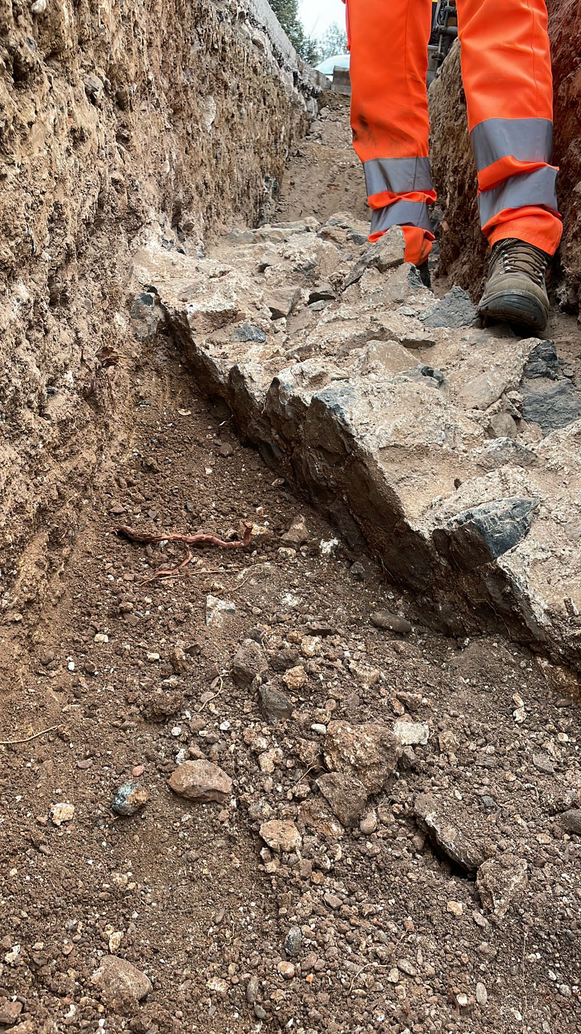 In particolar modo si temeva, ma anche si auspicava, che il percorso nel punto delle Grotte intercettasse qualche traccia del collegamento tra la cisterna romana ubicata sopra la collina e la villa sottostante; pertanto la dott.ssa Debora Ascione della ditta SAP di Mantova che effettuava la sorveglianza per conto di Terna era in contatto in tempo reale con la dott.ssa Lorella Alderighi funzionario archeologo della Soprintendenza; l’appuntamento con l’archeologia è stato rispettato: al di sotto del manto stradale, nel lato verso la collina sovrastata dalla cisterna romana, sono affiorati resti di strutture in opus reticulatum (opera reticolata) con pietre (cubilia) dello stesso tipo e colore (serpentino e calcare) delle strutture monumentali delle Grotte, ovviamente in relazione con esse.