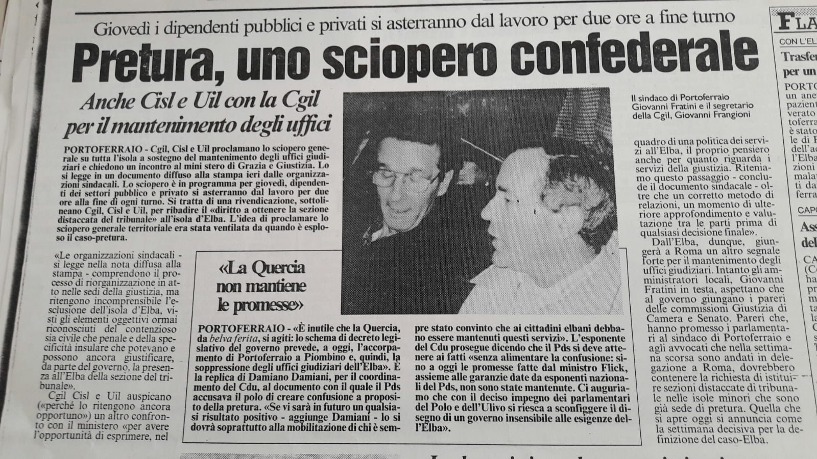 Allora era il segretario della locale CGIl, Giovanni Frangioni, con un post sulla sua pagina Facebook ricorda quando nel 1998, ben 24 anni fa si scioperava per il mantenimento del tribunale all’Elba. Giovanni Fratini era invece sindaco di Portoferraio, insieme ai suoi colleghi attendeva le risposte dalla commissione giustizia di Camera e Senato. Gli avvocati si erano recati a Roma a portare le istanze elbane. L’articolo del “Tirreno” si chiudeva con una frase emblematica. “Quella che si apre oggi è una settimana decisiva per la definizione del caso Elba”. E sono trascorsi 24 anni, una settimana lunga!