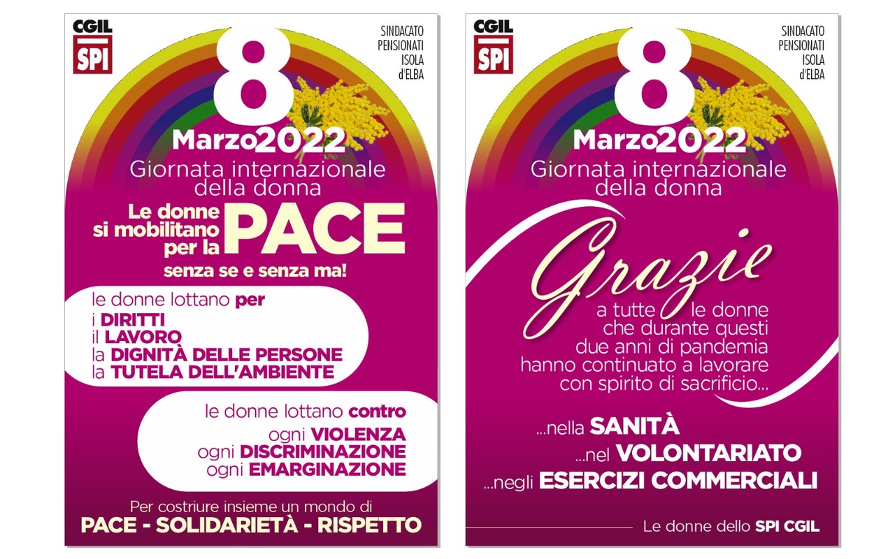 Si avvicina l’8 marzo e quindi “La giornata internazionale della donna”. Come ogni anno il sindacato pensionati della Cgil elbano lancia messaggi di pace e solidarietà. Quest’anno sono stati realizzati due manifesti da far circolare per l’Isola, in un momento di grande crisi per i due anni di pandemia che stiamo vivendo e da poco purtroppo si è aggiunta un’altra grande negatività, la peggiore, una guerra ai confini dell’Europa, in grado di sconvolgere la vita di migliaia di persone. E il messaggio dello Spi-Cgil si fa ancora più forte e significativo, con le donne, in particolare le aderenti al sindacato della Camera del Lavoro, che ha sede in via Bechi a Portoferraio, le quali si mobilitano per gridare a tutti il bisogno di pace, senza se e senza ma, affermando che la guerra è una assurdità, una pratica violenta, propria di un mondo vecchio, superato e da dimenticare, che ha perpetuato la soluzione di controversie tra i popoli con l’uso della forza militare. Nel terzo millennio le eventuali problematiche tra le nazioni si devono risolvere solamente col dialogo, con intese ed eventuali compromessi, essendo la popolazione mondiale unica e bisognosa sempre di più di soluzioni solidali. La guerra, lo sanno tutti, anche i bambini, porta morte e distruzione ed è la negazione della bellezza della vita e va abolita per sempre. Inoltre, in questo giorno dedicato alle donne, le aderenti allo Spi Cgil, ribadiscono che occorre impegnarsi per il diritti sociali in generale, in particolare quelli riferiti al mondo del lavoro, nel quale la donna non ha ancora neppure parità di stipendi e c’è ancora da puntare alla tutela della dignità delle persone e al rispetto dell’ambiente. Ancora oggi milioni di italiani vivono in povertà: si devono trovare energie, risorse e strategie per eleminare tale piaga sociale.