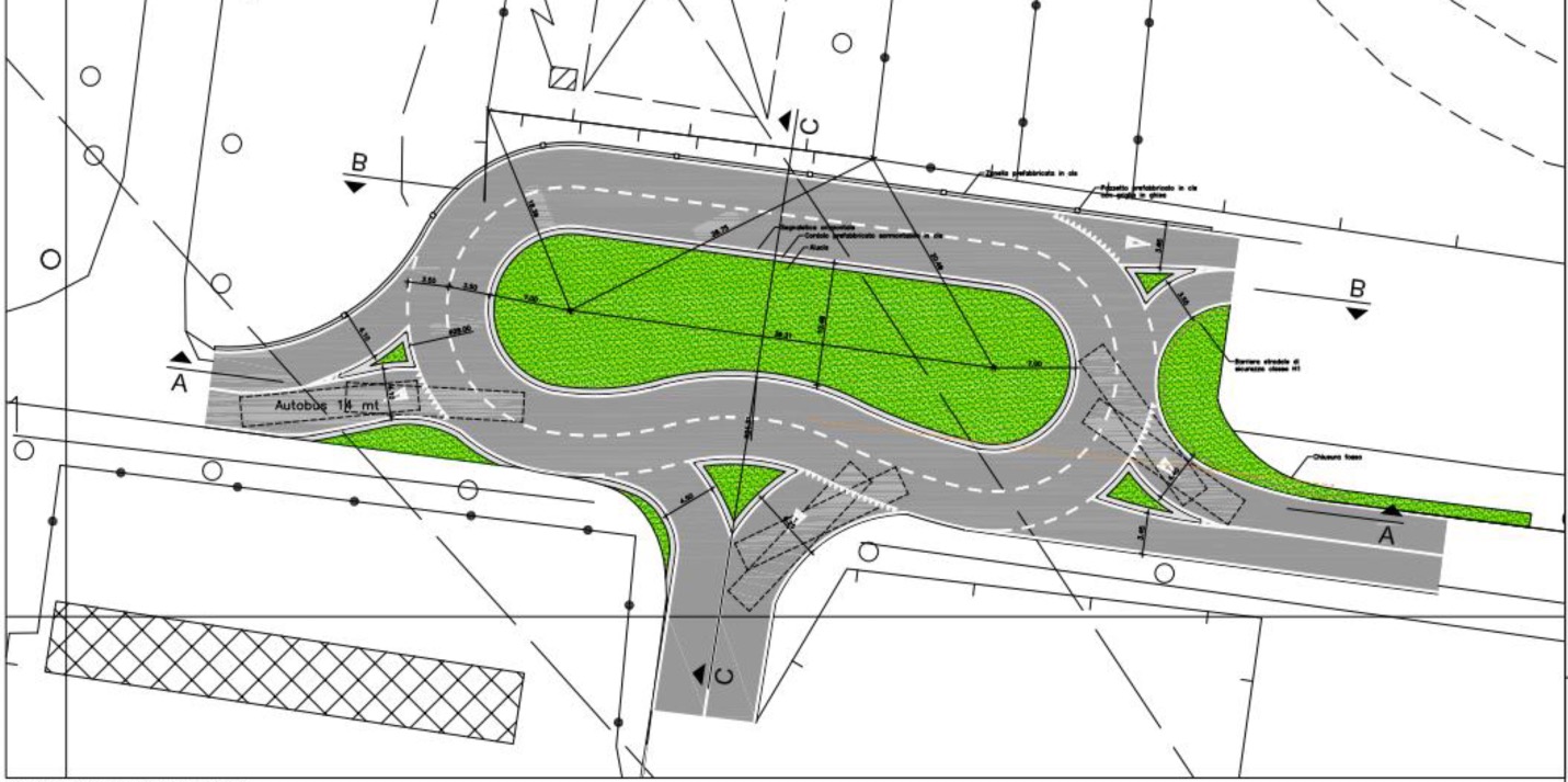 In termini esecutivi l’intervento progettato prevede l’abbattimento delle piante a margine della strada, l’intubazione della porzione del fosso di deflusso delle acque piovane per tutta la lunghezza della rotatoria, la realizzazione al centro di essa di una predisposizione per la corrente elettrica per poter realizzare successivamente l’illuminazione pubblica, la scorticatura superficiale del tracciato, la realizzazione della nuova fondazione e del nuovo manto stradale, la posa in opera delle cordolature e la sistemazione delle aiuole. In corrispondenza della zona della recinzione degli impianti sportivi è prevista la realizzazione di una zanella per il deflusso delle acque meteoriche e la realizzazione di una linea fognaria per il deflusso delle stesse acque. E’ prevista infine la realizzazione dell’apposita segnaletica orizzontale e la fornitura e posa in opera di barriera stradale di sicurezza a protezione del bordo laterale.