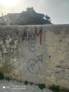 Una scritta per festeggiare un anniversario, di solito, si fa su Facebook. Almeno non si fanno danni, e il messaggio è più diretto. Purtroppo, invece, nel 2022 c’è ancora chi si diverte con le bombolette spray ad imbrattare le mura, per giunta in un sito di grande valenza storica come le mura dei camminamenti che portano a Forte Falcone, sopra la spiaggia delle Viste, a Portoferraio.