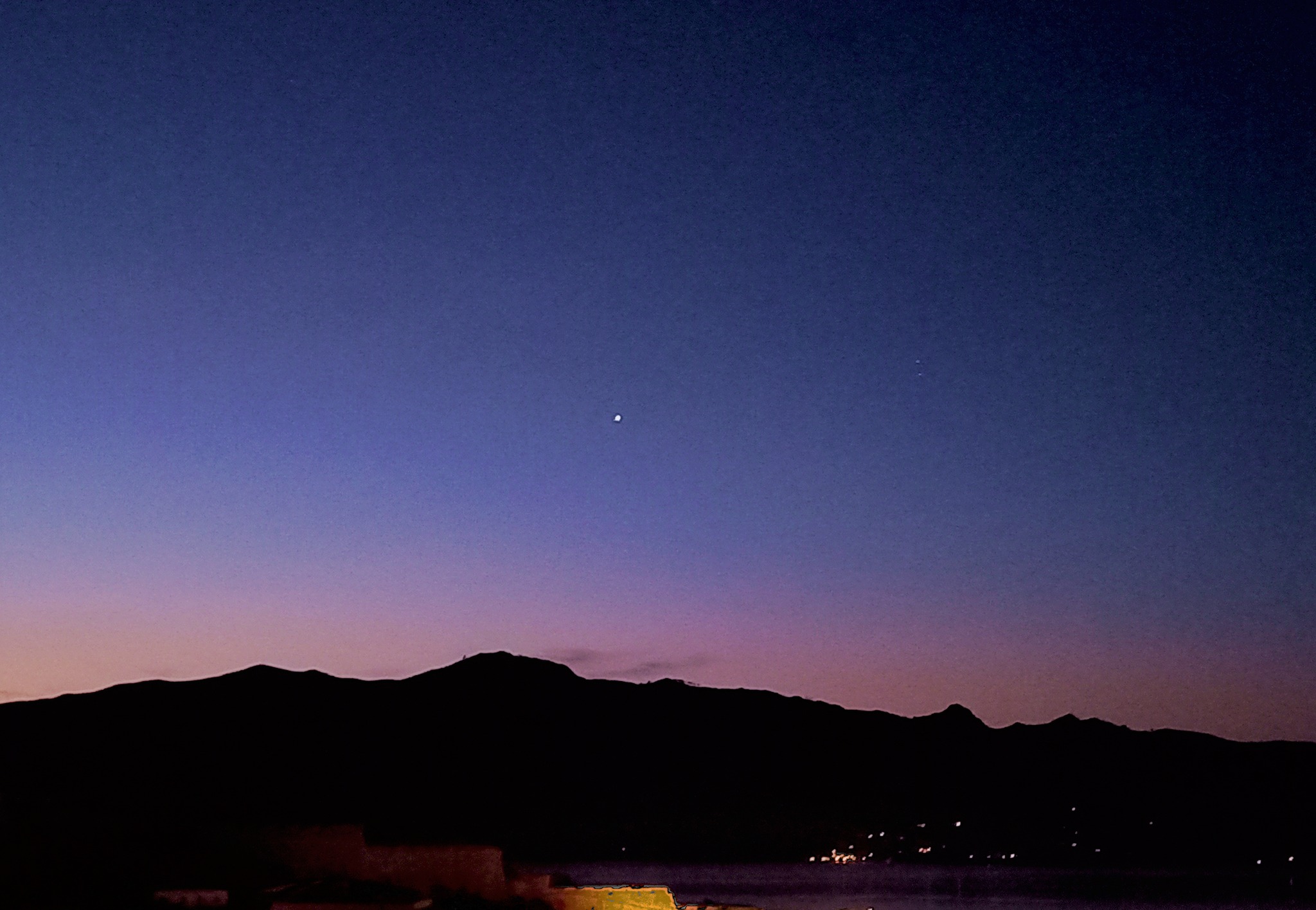 Il puntino più luminoso è il pianeta Venere, distante da noi, oggi, circa 120 milioni di chilometri. Più a destra, i due puntini molto vicini sono Saturno (sopra) e Marte (sotto).