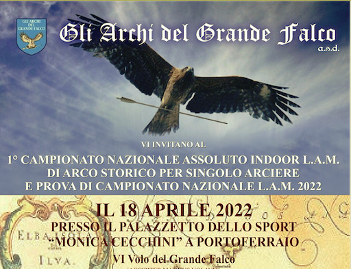 Il 18 aprile verra’ infatti disputata per la prima volta in assoluto in Italia,il “1° CAMPIONATO NAZIONALE ASSOLUTO INDOOR L.A.M. DI ARCO STORICO PER SINGOLO ARCIERE E PROVA DI CAMPIONATO NAZIONALE L.A.M. 2022” ,organizzata con grande orgoglio dal nostro gruppo “Gli Archi del Grande Falco a.s.d.”.