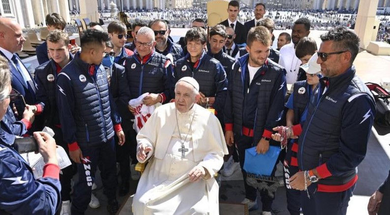 Ve lo anticipiamo estrapolandolo dal documento intero, che troverete qui sotto da leggere per intero per chi lo volesse, unendo altre foto che non esitiamo a definire “storiche” per il gruppetto di fortunati al seguito della “Nazionale” elbana di calcio ricevuta oggi dal Pontefice.
