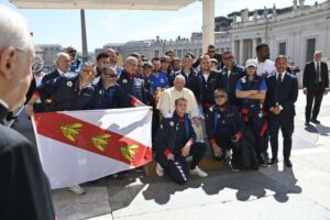 “Rivolgo un cordiale benvenuto ai pellegrini di lingua italiana. In particolare, saluto le Suore della Compagnia di Maria Nostra Signora, le Monache Clarisse di Anagni, l’Azienda Sanitaria di Napoli 3 Sud, la Società di Calcio Isola d’Elba: vinceranno il campionato! Un pensiero speciale ricolgo ai fedeli di Vignale Monferrato, accompagnati dal Vescovo e rinnovo la mia gratitudine per quanto hanno fatto in favore del giovane del Ghana, malato terminale. Grazie
