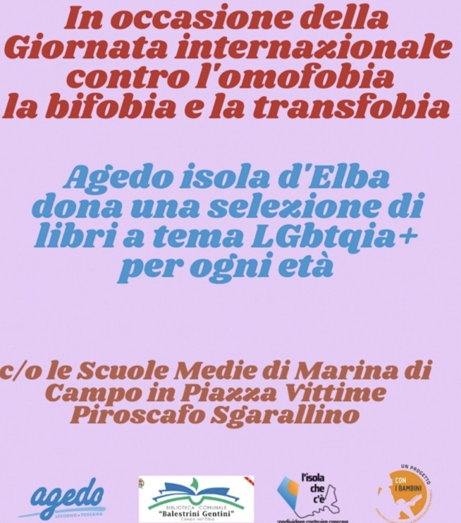 A conclusione del progetto Inclusione a Colori che ha coinvolto tutte le classi della scuola secondaria di primo grado dell´ICS G. Giusti di Marina di Campo e in occasione della Giornata internazionale contro l’omofobia, la bifobia, e transfobia celebrata il 17 Maggio, Agedo Livorno-Toscana, partner del progetto L ́Isola che c’è, che ricordiamo è sostenuto dall’impresa sociale Con i Bambini nell’ambito del Fondo per il contrasto della povertà educativa minorile all’Elba, dona una selezione di libri a tema Lgbtqia+ alla Biblioteca comunale “Balestrini Gentili”. I libri sono stati scelti pensando ad ogni fascia di età, dalla prima infanzia all´etá adulta, e rappresentano un valido materiale di supporto per gli insegnati e i genitori interessati ad educare alle differenze e al rispetto. Chiunque sia interessato può partecipare all’evento che si terrà giovedì 27 maggio alle ore 17.30 presso la Biblioteca Comunale (c/o le Scuole Medie di Marina di Campo in Piazza Vittime Piroscafo Sgarallino).