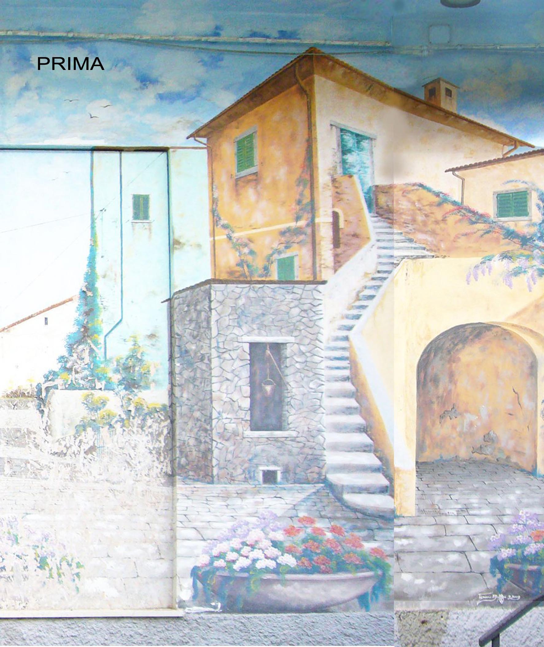 Ma le favole non sempre hanno un lieto fine. Nessun principe si innamorò e convolò a nozze su questa piazzetta…. Arrivò un giorno un “orco malvagio”, che senza nemmeno sapere perché diede una bella mano di bianco su questa parete cancellando con ignoranza e spavalderia tanto lavoro e abnegazione.