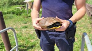 Legambiente ringrazia i Carabinieri Forestali e il Parco Nazionale per il pronto intervento e ricorda che abbandonare animali non è solo un reato ma anche un atto scriteriato che, soprattutto in una zona umida come Mola, mette a rischio la fauna autoctona. Inoltre l’abbandono di specie aliene e il loro successivo recupero e isolamento costituiscono un danno economico per tutta la comunità. In particolare, la testuggine palustre americana è elencata dall’Unione europea come “specie aliena invasiva di rilevanza unionale”. E’ una testuggine d’acqua dolce facilmente riconoscibile per via delle vistose macchie di forma allungata ai lati del capo di colore rosso o giallo e delle strisce gialle sul collo. La corazza ossea (carapace) ha un colore verde oliva o marrone nei giovani e si scurisce progressivamente con l’età e può raggiungere fino a 30 cm di lunghezza. I maschi rispetto alle femmine sono più piccoli, hanno una coda più lunga, robusta e larga alla base, unghie molto sviluppate e il carapace è appiattito. Le femmine hanno coda e unghie corte e il carapace è arrotondato. Opportunista onnivora si ciba di una ampia varietà di piante ed animali (alghe filamentose, macrofite, lumache, larve, insetti, crostacei e piccoli vertebrati), causando danni all’intero habitat nel quale viene introdotta una di queste testuggini.