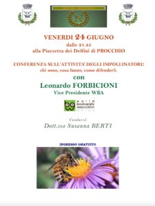 Venerdì’ 24 giugno nella piazzetta dei delfini a Procchio alle 21,45, si terrà una conferenza sull’attività degli impoliinatori. Chi sono? cosa fanno? come difenderli? Alla serata saranno presenti Leonardo Forbicioni, Naturista ed Entomologo, vice Presidente del WBA (World Biodiversity Association) oltre che Responsabile del NatLab di Portoferraio, tratterà l’argomento degli “Impollinatori”. Interverrà Susanna Berti in rappresentanza del PNAT ed in qualità di vice-sindaco del comune di Marciana. L’ingresso è gratuito.