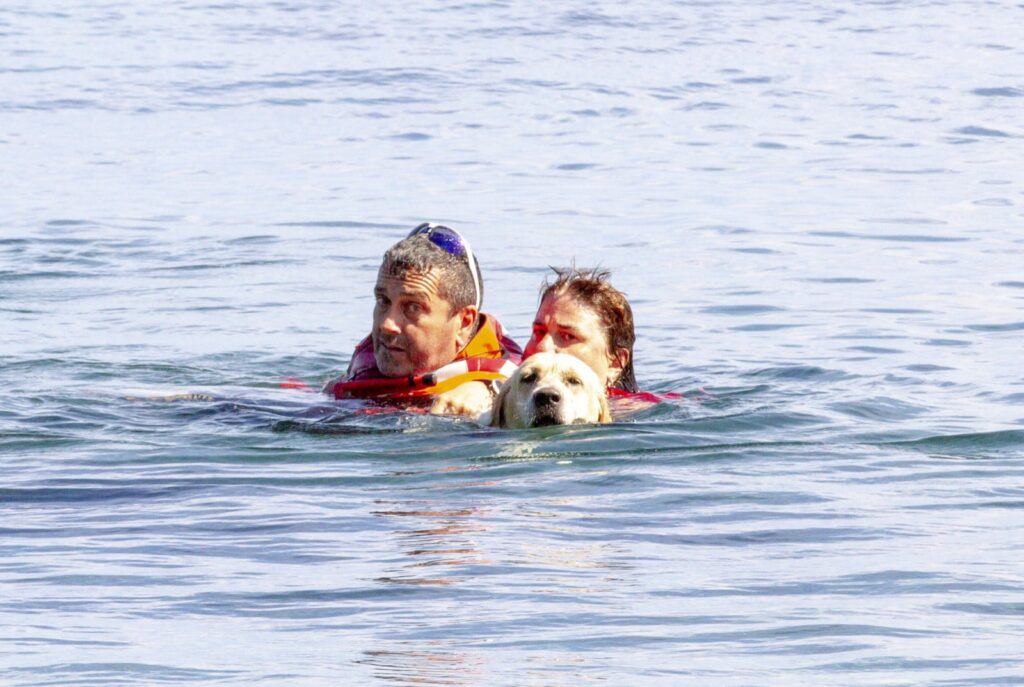 aggrapparsi all’imbrago del cane ed essere trasportati a riva.
