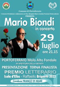 Cresce l’attesa per il concerto di Mario Biondi organizzato dal Comune di Portoferraio in collaborazione con l’Associazione Albergatori isola d’Elba ed il comitato promotore del premio letterario ‘Isola d’Elba – Raffaello Brignetti’ in programma il 29 luglio alle 21.15 a Portoferraio (Molo Alto Fondale). In apertura di serata è prevista la presentazione della terna finalista del premio letterario ’Isola d’Elba – Raffaello Brignetti’. La serata sarà condotta da Franco Di Mare, giornalista Rai. L’ingresso è gratuito. E’ possibile prenotare i posti a sedere telefonando al 3347525489 tutti i giorni, festivi compresi, dalle 10 alle 12 o dalle 16 alle 18, o inviando una e-mail all’indirizzo: mariobiondielba@libero.it.