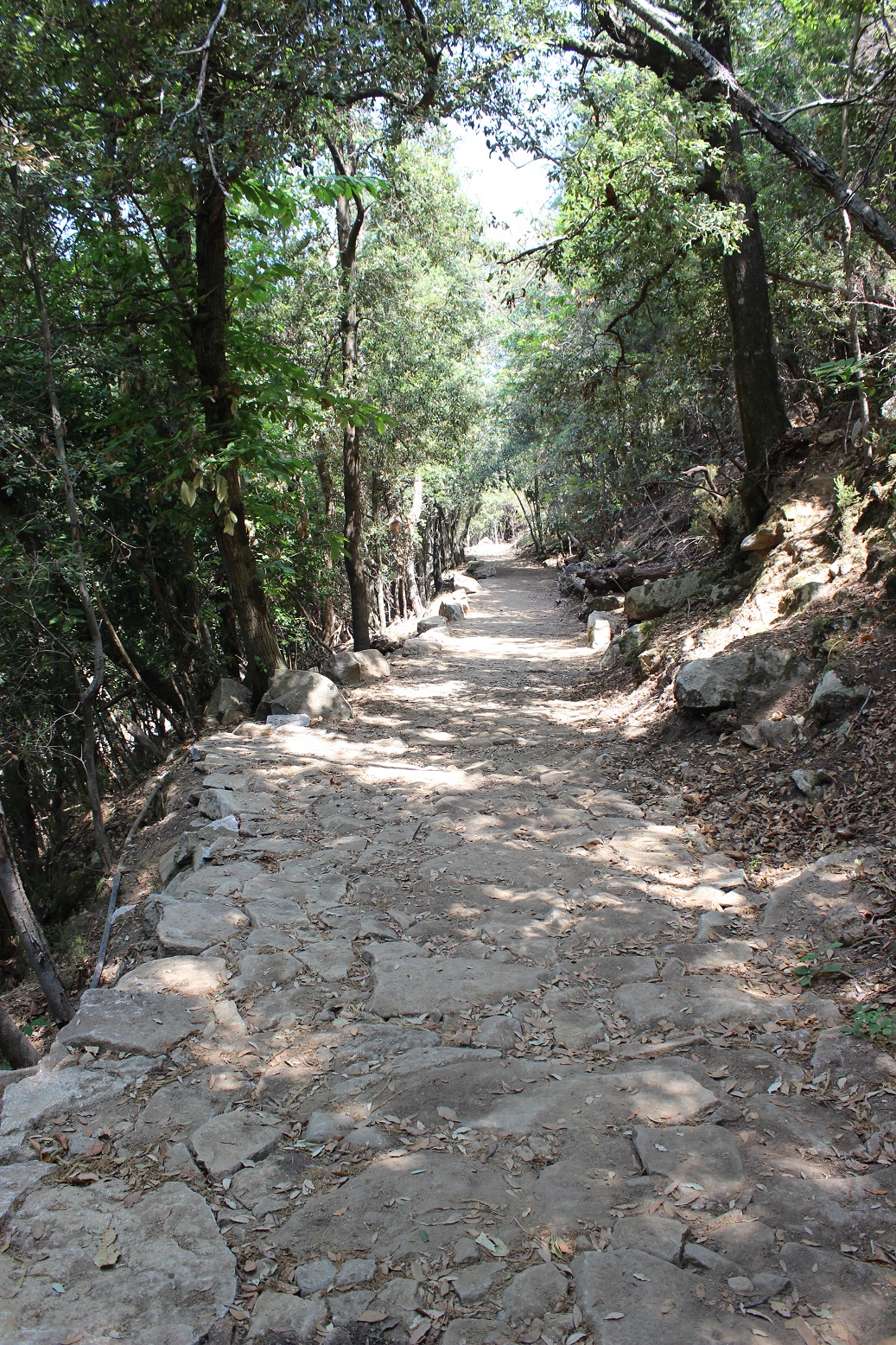 Nel corso delle attività di restauro, effettuate dall’Impresa Cellini e dirette dall’Architetto Alessandro Pastorelli, particolare attenzione è stata posta allo studio del sottofondo originario, al fine di restituire al sentiero un’efficace resistenza meccanica e permettere una maggiore permeabilità delle acque meteoriche. Si è quindi proceduto al recupero e alla catalogazione dei blocchi di granodiorite e alla posa dei tagliacque, fondamentali per ripristinare il naturale e storico ruscellamento delle acque superficiali, in modo da garantirne il corretto percorso fino a valle, scongiurando cedimenti del terreno. Infine, la posa dei lastroni superficiali è stata effettuata nel maggior rispetto possibile delle antiche collocazioni e delle tecniche costruttive del sentiero, al fine di restituirlo ai visitatori nella sua forma e solidità originarie.