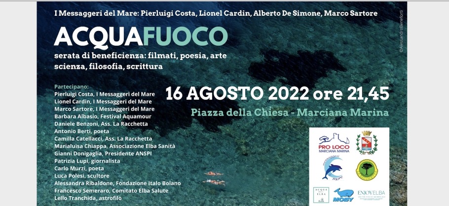 Fra i partecipanti, dopo il saluto dell’Amministrazione di Marciana Marina, l’ingegnere elettronico e istruttore subacqueo Marco Sartore, i poeti Antonio Berti e Carlo Murzi, Gianni Donigaglia Presidente dell’Associazione Nazionale Sanità Piccole Isole, Marialuisa Chiappa e Francesco Semeraro rispettivamente dell’associazione Sanità Elba e del Comitato Elba Salute, lo scultore Luca Polesi, Camilla Catellacci e Daniele Benzoni dell’Associazione La Racchetta, l’astrofilo Lello Tranchida. Partner dell’iniziativa Acqua dell’Elba con la neonata Fondazione. Alla fine della serata si parlerà del prossimo progetto per salvare i Delfini dalle stragi nelle isole Far Oer. Perché? – Chiediamo a Lionel e Pierluigi. “Perché il nostro più grande desiderio è quella di diventare, nella prossima vita, una creatura del mare”.