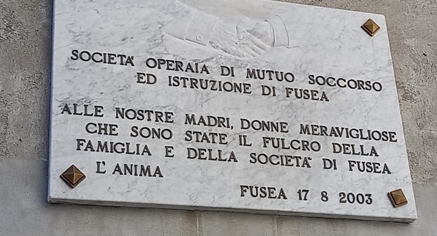 (Lapide marmorea nella piazzetta del paese di Fusea nel Friuli Venezia Giulia.In alto è visibile scolpito lo stemma della società operaia di mutuo soccorso: due mani che si stringono fortemente)