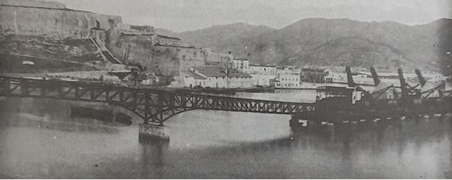 (Ponte Hennin dello satabilimento siderurgico di Portoferraio per il carico delle navi mercantili.Immagine riferibile ai primi anni del novecento.Sullo sfondo il fronte di attacco delle fortezze quando ancora non erano state costruite le palazzine e quando ancora era presente la tonnara abbarbicata alle mura mediceo-lorenesi )