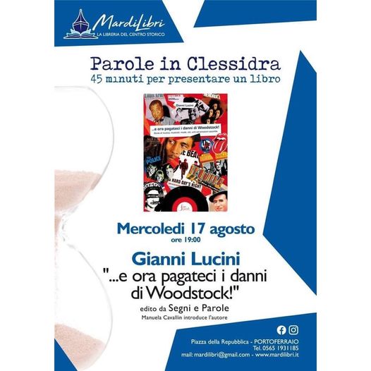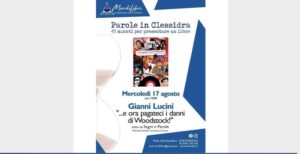 “…..E ora pagateci i danni di Woodstock “Un titolo già di per sé molto esplicativo e diretto quello che Gianni Lucini, giornalista, sceneggiatore, autore teatrale e cinematografico e televisivo, ha dato al suo testo edito da Segni e Parole, che verrà presentato mercoledì 17 agosto, alle ore 19, a “Parole in clessidra”, lo spazio per raccontarsi e raccontare la propria opera che dura il tempo di un giro di clessidra.