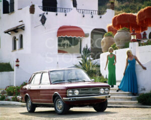 – 1972, Fiat 132: la berlina medio-alta, qui nell’allestimento S (rosso Etna) e Normale (bianco), che sostituisce la 125 e che da metà degli anni 70 diventa l’ammiraglia Fiat, modello di punta della gamma complice la crisi energetica che anticipa il pensionamento della impegnativa 130.