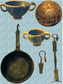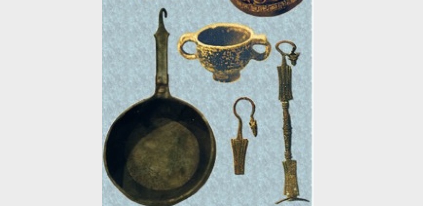 Necropoli del Profico. Vasi a vernice nera ,padella e manici di infundiboli in bronzo .II-I secolo a.C. In Michelangelo Zecchini opera citata