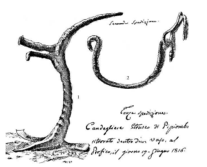 Necropoli del Profico.Candelabro di piombo e maniglia di bronzo (II secolo a.C.) di MELLINI documentazione grafica 1816.Da Michelangelo Zecchini opera citata (https://www.academia.edu/40642233/LA_NECROPOLI_TARDO_ETRUSCA_E_ROMANA_DEL_PROFICO_PRESSO_CAPOLIVERI_ISOLA_DELBA)
