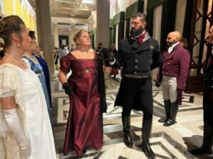 L’amministrazione comunale di Portoferraio ha avuto un ruolo primario nell’organizzazione e nell’allestimento degli eventi previsti nell’ambito della premiazione della 18ª edizione del Premio del Gruppo del Gusto della Associazione della Stampa Estera in Italia svoltasi nell’ultimo fine settimana all’isola d’Elba. Il Comune capoluogo, oltre ad accogliere i giornalisti stranieri accreditati nella spettacolare cornice del Chiostro del Centro Culturale De Laugier, dove ha avuto luogo il light lunch di benvenuto a base di specialità tipiche elbane, ha messo a disposizione il teatro napoleonico dei Vigilanti intitolato a Renato Cioni che ha fatto da degno scenario alla consegna dei riconoscimenti. Una location che ha lasciato a bocca aperta i graditi ospiti nella quale sono riecheggiate anche suggestive musiche di epoca napoleonica. Un tema, quello dell’esilio dorato dell’imperatore francese all’isola d’Elba, che ha caratterizzato la cena di gala allestita nella straordinaria ambientazione della Galleria Demidoff del Museo Nazionale della Residenza Napoleonica di Villa San Martino. Qui lo chef Michele Nardi ha proposto un menù ottocentesco che ha riscosso unanimi apprezzamenti, l’associazione culturale ‘Historiae’ ha dato vita ad un coreografico ballo di corte con una decina di figuranti in costume d’epoca e l’altra associazione napoleonica elbana ‘La Petite Armèe’ ha garantito l’arrivo …del ‘Grande Corso’ in persona, accompagnato nell’occasione dal generale Bertrand e da un drappello di soldati con le loro caratteristiche uniformi.