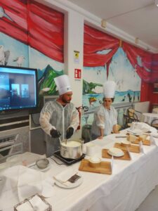 Nel primo incontro, i ragazzi della Terza enogastronomia guidati dal prof. Bellomo, dalla prof.ssa Fortuna Sarappa, dal prof. Mario Di Padova e dall’assistente tecnico di sala e bar Claudio Marzano sono stati coinvolti dai titolari dell’azienda, Daniele e Moira Mattera, nella realizzazione di tre formaggi (uno stracchino, un primo sale e una ricotta). I ragazzi, oltre a partecipare attivamente alla lavorazione dei formaggi sono intervenuti ponendo interrogativi che hanno fatto emergere la passione per metodologie di produzione e di lavoro che rispettano i tempi e i limiti dell’ecosistema e la vita degli animali, come del resto è nel modus operandi de Il Caprile, che si definisce “laboratorio artigianale”. All’incontro è intervenuta anche la Dirigente Scolastica prof.ssa Alessandra Rando, che ha sottolineato l’importanza per l’Istituto Alberghiero di creare legami con le aziende di produzione enogastronomica del territorio che puntano sulla sostenibilità, tema cardine della declinazione della transizione ecologica in ambito educativo, e hanno una visione etica del consumo.