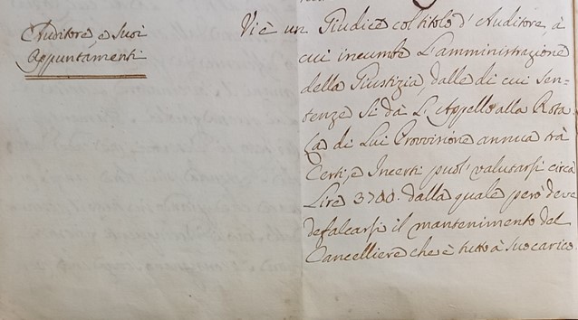 Vi è un giudice col titolo di Auditore a cui incombe l’amministrazione della giustizia dalle di cui sentenze si dà l’appello alla Rota. La di lui provvisione annua tra certi ed incerti puol valutarsi circa lire 3700 dalla quale però deve defalcarsi il mantenimento del Cancelliere che è tutto a suo carico”