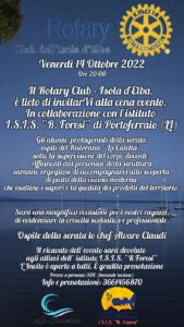 Venerdì 14 ottobre alle 20.00, il Rotary Club Isola d’Elba organizza una cena evento in collaborazione con l’istituto I.S.I.S. Foresi di Portoferraio . Gli alunni ospiti della serata al ristorante la Caletta di Porto Azzurro, sotto la supervisione del corpo docente, affiancati dal personale della struttura, saranno orgogliosi di presentare alcuni piatti di cucina moderna che esaltino i sapori e la qualità dei prodotti del territorio. “Sarà una magnifica occasione per i nostri ragazzi di evidenziare la crescita scolastica e professionale” dicono gli organizzatori. Ospite della serata lo Chef Alvaro Claudi. Il ricavato dell’evento sarà devoluto agli allievi dell’istituto.