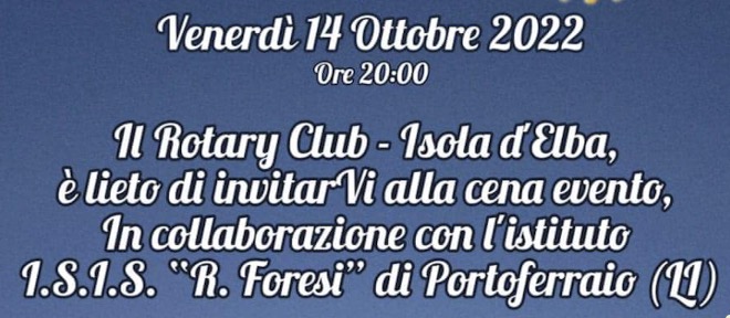 Venerdì 14 ottobre alle 20.00, il Rotary Club Isola d’Elba organizza una cena evento in collaborazione con l’istituto I.S.I.S. Foresi di Portoferraio . Gli alunni ospiti della serata al ristorante la Caletta di Porto Azzurro, sotto la supervisione del corpo docente, affiancati dal personale della struttura, saranno orgogliosi di presentare alcuni piatti di cucina moderna che esaltino i sapori e la qualità dei prodotti del territorio. “Sarà una magnifica occasione per i nostri ragazzi di evidenziare la crescita scolastica e professionale” dicono gli organizzatori. Ospite della serata lo Chef Alvaro Claudi. Il ricavato dell’evento sarà devoluto agli allievi dell’istituto.