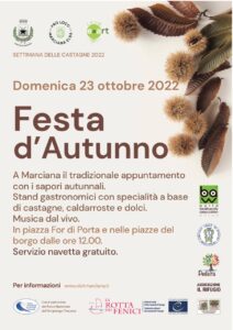 A Marciana la Festa d’Autunno inizierà alle ore 12.00 in piazza For di Porta e nelle piazzette interne con stand gastronomici che proporranno specialità a base di castagne, caldarroste e dolci. Seguirà musica dal vivo.