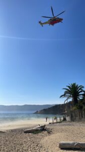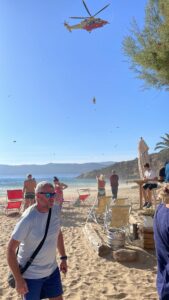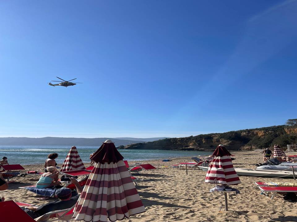 Nel frattempo le condizioni del piccolo non sembravano essere così gravi come apparivano in un primo tempo, ma gli operatori sanitari in servizio su Pegaso decidevano di intervenire sul posto, calando uno di loro con un verricello di fronte ai numerosi bagnanti che affollavano la spiaggia in quel momento, mentre il Pegaso andava ad atterrare nel parcheggio sterrato retrostante la spiaggia.