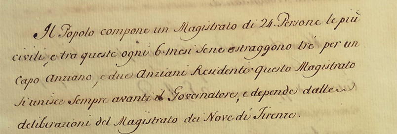 “ …il popolo compone un magistrato di 24 Persone le più civili e tra queste ogni sei mesi se ne estraggono tre per un capo anziano e due anziani residenti .Questo Magistrato si unisce sempre davanti al Governatore e depende dalle deliberazioni del Magistrato dei Nove… “