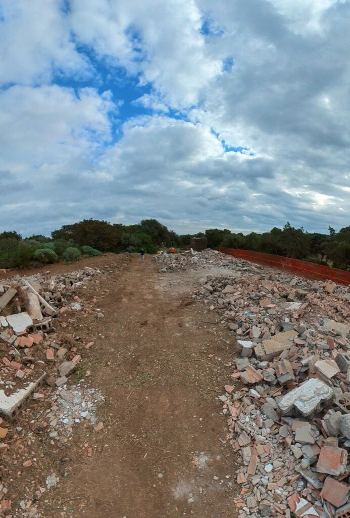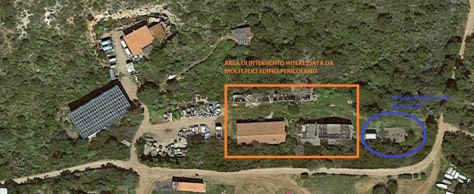 La zona si trova a centro isola, in prossimità della piazzola di elisoccorso ed è interessata, da decenni, dalla presenza di una serie di ruderi fatiscenti e pericolanti. L’area, oggi di competenza comunale, è stata concessa dal Comune dell’Isola del Giglio al Parco Nazionale sulla base di uno specifico accordo convenzionale, al fine di realizzare un vero e proprio centro servizi. La zona verrà infatti liberata dai ruderi, risanata e successivamente sarà oggetto di interventi che prevedono la realizzazione di alloggi, foresterie ed uffici attraverso la costruzione di alcuni piccoli edifici in bioedilizia. Il progetto realizzato e finanziato dall’Ente Parco ha un costo complessivo di circa 1 milione e 100mila euro; la fase delle demolizioni che sta per essere terminata ne costituisce il primo lotto funzionale. L’intervento segue quello già realizzato nella zona attigua che ha visto l’installazione dei bagni pubblici, realizzati sempre dal Parco Nazionale. Se è vero che il cosiddetto centro servizi apparterrà al prossimo lotto di lavori, è anche vero che possiamo considerare storico questo momento; momento nel quale una parte dell’ isola torna ad essere libera da edifici pericolanti in cemento, abbandonati e rimasti nel degrado più totale, spesso non solo come elementi che deturpano il paesaggio, ma anche come ricettacolo di altri rifiuti.