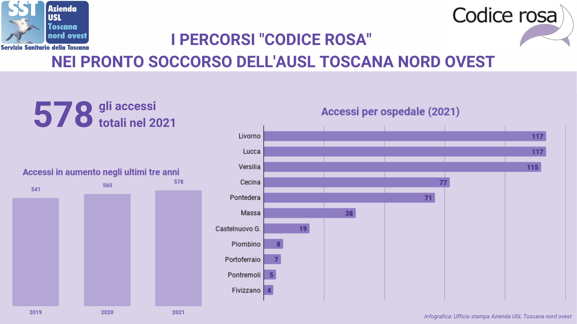 Negli ultimi tre anni le persone che segnalano di essere state vittime di violenza o abusi sono cresciute. Lo rivelano i dati dall’Azienda USL Toscana nord ovest sugli accessi al percorso “Codice rosa” attraverso gli 11 pronto soccorso degli ospedali aziendali: nel 2021 sono stati 578 in totale, 18 in più rispetto al 2020 (quando gli accessi erano stati 560) e 37 in più rispetto al 2019 (quando gli accessi furono 541). Nei primi sei mesi del 2022 gli accessi registrati sono stati 283.