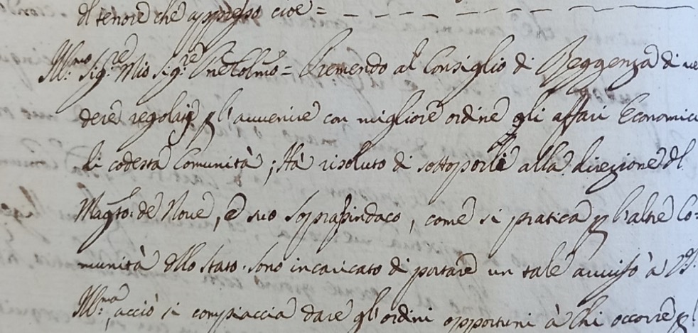 Premendo al Consiglio di Reggenza di rendere regolari per l’armonia con miglior ordine li affari economici di codesta Comunità ha risoluto di sottoporli alla risoluzione del Magistrato de Nove e suo Soprassindaco come si pratica per l’ altre Comunità dello Stato. Sono incaricato di portare un tale avviso a VS Ill.ma acciò si compiaccia dei are gli ordini opportuni a chi occorre per l’esecuzione e pieno d’ossequio mi confermo,