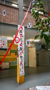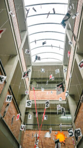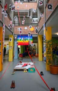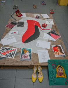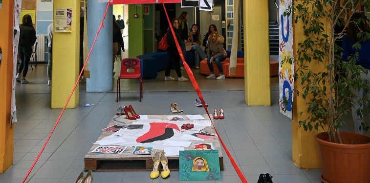 Quattro le parole chiave: vita, maternità, lotta, profumo. Parole scelte pensando alle nostre mamme, ci dicono i ragazzi. E al centro, ben visibile dall’alto, una scarpa rossa con il tacco rotto. L’Installazione diventa quindi spazio interattivo, ci dice la Professoressa Oscos, che si può percorrere ed occupa in verticale tutta la scuola, con l’idea di abbracciare lo spazio nella sua interezza. Un’opera percorribile creata con il cuore di chi scrive nell’ aria.