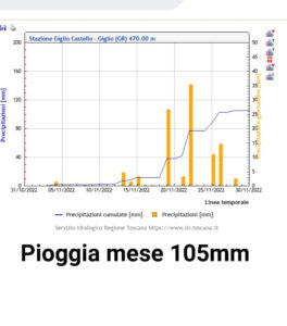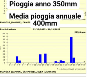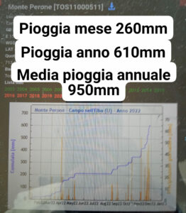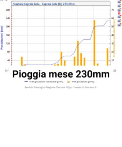 “Nella grafica – si legge nel post – alcuni dati mensili, annuali e di pioggia media annuale su dati trentennali; oltre ai dati in grafica segnaliamo Gorgona con 145mm mensili e 460mm da inizio anno, Patresi (Elba) con 165 mm mensili e 335mm da inizio anno , Montecristo con 135mm e 360mm da inizio anno e Capoliveri (Elba) da stazione meteo locale 275mm mensili e circa 500mm da inizio anno”.