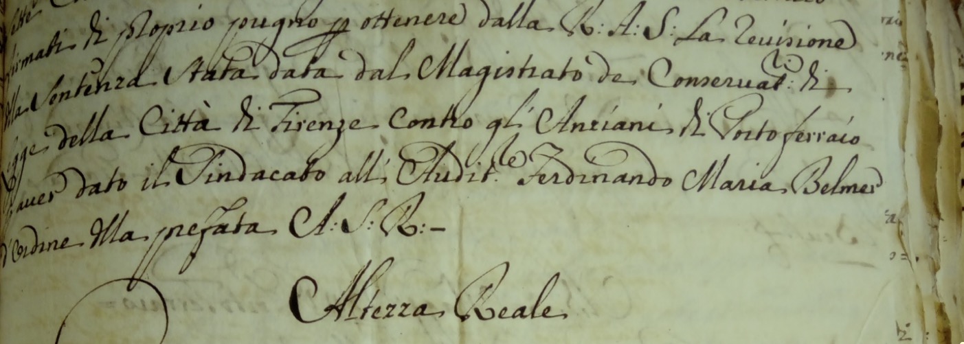 “Copia della supplica stata fatta a S.A.R. da diciassette comunisti del Consiglio Generale della Citta di Portoferraio firmati di proprio pugno per ottenere dalla R.A.S. la remissione della sentenza stata data dal Magistrato dei Conservatori di legge della città di Firenze contro gli Anziani di Portoferraio per aver dato il Sindacato all’Auditore Ferdinando Maria Belmer d’ordine della prefata S.A.R.